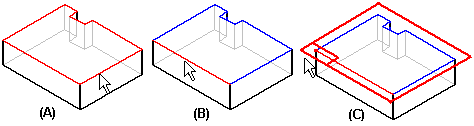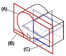 当使用这些选项根据零件面 (A) 创建新的参考平面时,新建参考平面的 X 轴方向 (B) 会使用该零件面上的直线边 (C) 进行自动定义。