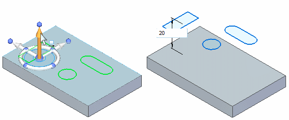要完成如图所示的移动,请在设计意图面板或高级设计意图面板上关闭“共面”设置。如果未关闭,则面和草图将一起移动,因为它们共面。