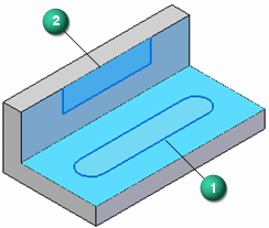 如果一系列草图元素自身闭合 (1),或草图元素与一条或多条模型边形成闭合区域 (2),则会自动形成草图区域。