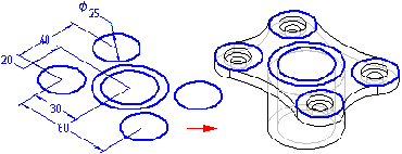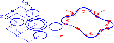 在复制草图元素之后,可以使用绘图命令修改这些元素。例如,可能需要将元素添加至草图中未包含的轮廓中。也可以添加尺寸以及活动轮廓平面和草图中元素之间的关系。