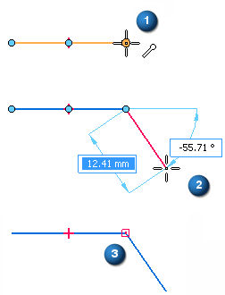 当智能草图显示关系指示符时,单击以放置新的直线 (1) 的第一个端点。此端点连接到前一直线的端点。