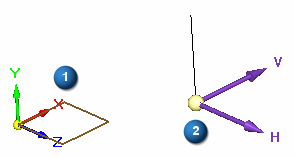 锁定到坐标系平面 (1) 时,命令条上的 Z: 坐标被禁用。相反,系统会显示一个锁定平面三重轴 (2)。锁定平面三重轴显示 H(水平方向)和 V(垂直方向)。命令条上的 X: 字段在 H 方向,Y: 字段在 V 方向。
