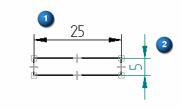 示例:在工程图环境中,驱动(锁定)尺寸为黑色 (1),解锁(从动)尺寸为深青色 (2)。