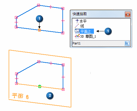 当选择共面关系图标 (1) 时,草图元素和共面平面变为高亮显示 (2)。
