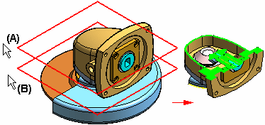 设置窗口中的剪裁深度。可以将剪裁深度限制在复杂零件或装配的一个狭小部分,以轻松完成当前任务。通过定位两个平面 (A) 和 (B) 来设置剪裁深度,这两个平面可定义显示的延伸量。