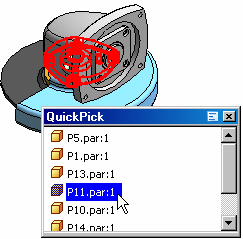 通过单击快速选取提示上指示的鼠标键,可在光标邻近位置显示动态列表,其中带有与每个零件对应的条目。让光标越过这些条目将高亮显示每一个相关零件,即使这些零件在视图中并不可见。单击一个条目可选择相关的零件。