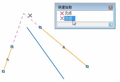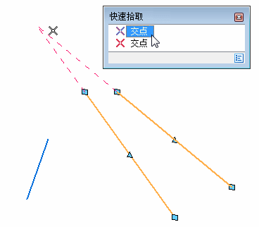 如果按 I 指定交点,并且如果有多个适用的交点,“快速选取”会打开一个列表,显示用光标定位的元素上的可能交点,最近一次的交点列出在第一位。例如:
