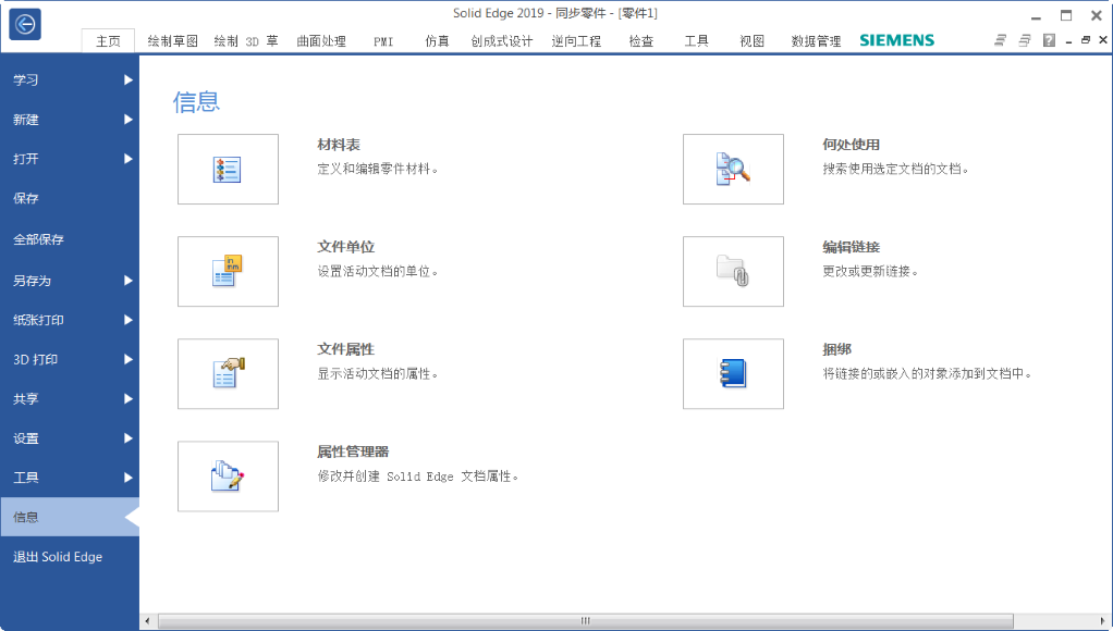 当您选择应用程序按钮时,所有关于操作活动文档的功能都显示为应用程序窗口左侧的选项卡式页面。后台页面上可用的命令和选项基于文档类型以及它是受管还是非受管。如果没有打开的文档,则选项更为有限。