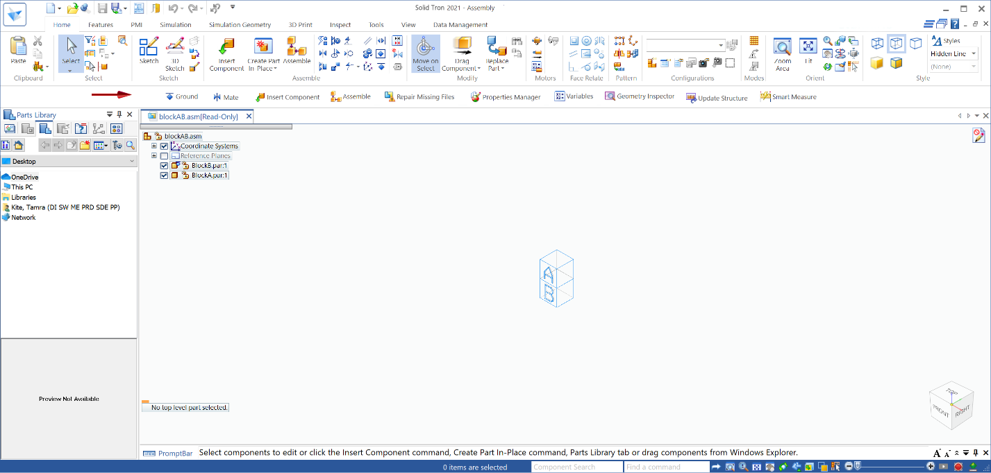 预测命令工具条显示在 创物3D 命令功能区下方。全新安装 创物3D 后,根据当前环境,此工具条将包含您最可能想要或需要的五项首要命令。在您工作时,将根据您的操作添加命令。在以下示例中,红色箭头指示符显示了应用程序界面中工具条的位置,以及在该特定装配的关联中显示的一组命令。