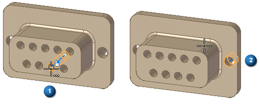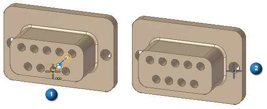 如果选择该选项,可以定位中心点 (1),因为它具有指派的端子。但是,不能选择圆柱面 (2),因为它没有指派端子。