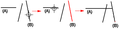 如果您要延伸至的元素不是最近的元素,您可以首先按住 Ctrl 键并选择此元素,以此来指定您希望延伸至的元素。例如,如果您要将一条水平线 (A) 延伸至一条斜线 (B),请按住 Ctrl 键并选择线 (B)。释放 Ctrl 键,然后选择直线(A)。