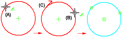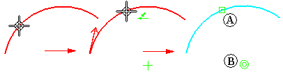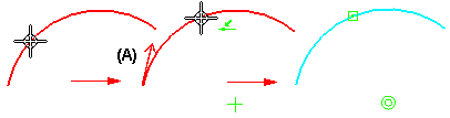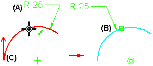 因为您可以对 2D 元素应用尺寸和标注,或从 2D 元素中构造曲面和实体特征,所以用方向箭头来表示所有后续元素重新附加到原始元素的那个部分。例如,当分割已应用尺寸的圆弧 (A) 时,该尺寸则重新附着到方向箭头 (C) 的起点圆弧 (B) 部分。