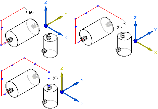 可继续锁定轴或平面,以帮助您定义路径 (A),(B),(C)。