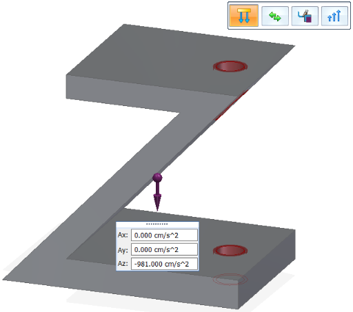 载荷方向和值 — 在设计空间质心处显示重力载荷符号。默认设置是沿零件的负 Z 方向施加重力,并且 Az 输入框中会显示重力载荷。可以使用命令条上的翻转按钮反转重力方向。这还会将 Az 值从负改为正。