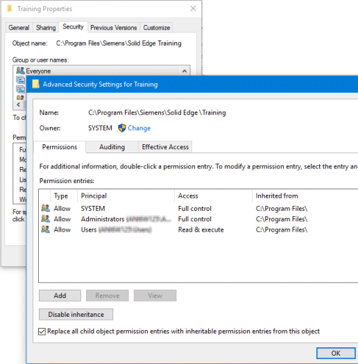 使用 Windows 资源管理器属性对话框指派和确认对保管库或保管库零件的权限,然后使用选项使用此对象的可继承权限条目替换所有子权限条目建立继承。