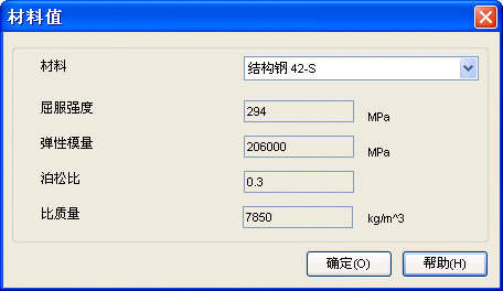 通过材料选择控件选择材料即可。屈服强度、弹性模量、泊松比和比质量的值将根据材料自动显示,这些值存储在数据库中。请记住,使用 SEER 标准材料时不可更改这些值。