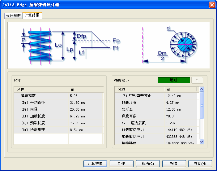 显示用于计算的输入和压缩弹簧的一些常规结果。