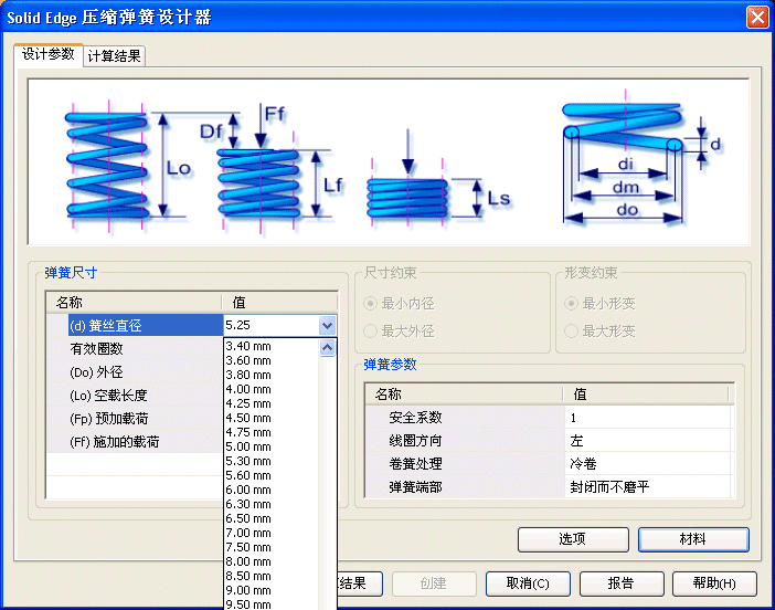 “设计参数”选项卡的“材料”按钮可用于选择弹簧材料。