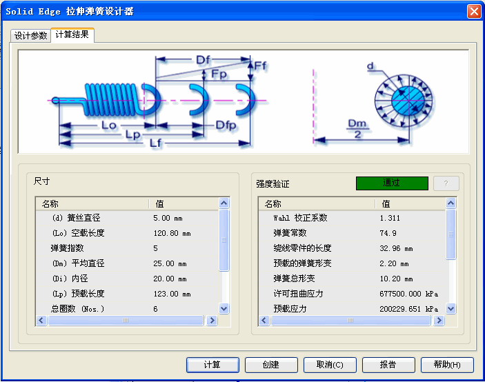 显示用于计算的输入和拉伸弹簧的一些常规结果。
