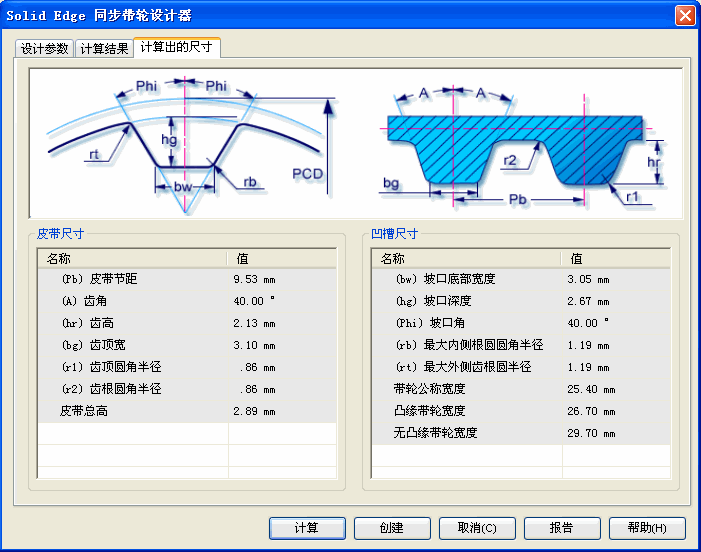 提供了用于查看附加计算结果的选项。这些结果是用于构造同步带的几何体的参数。